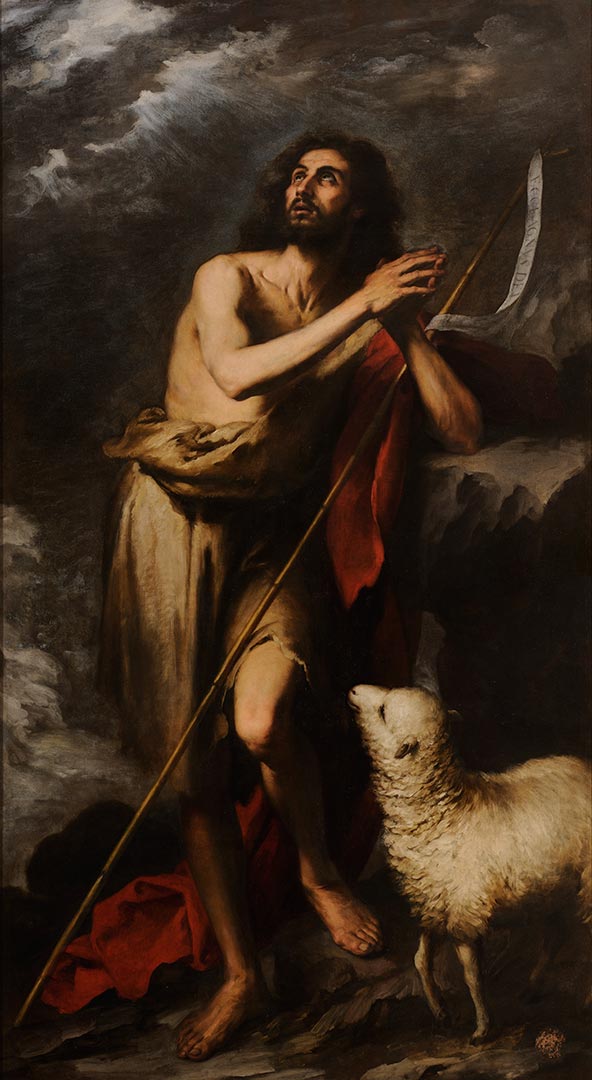 Sobre un fondo de paisaje, aparece la figura de san Juan Bautista, aislado y como anacoreta (persona que vive en un lugar solitario, dedicado a la contemplación y a la penitencia) en el desierto, de pie y mirando hacia el cielo como pidiendo a Dios poder cumplir bien su misión de anunciar al Mesías. Viste una túnica corta o sayo de pelo de camello y, sobre ella, un manto rojo como símbolo de su martirio. Entre sus manos lleva una cruz de cañas con una filacteria (la cinta con inscripción que aparece al final de la cruz) en la que figura la inscripción: Ecce Agnus Dei (Este es el Cordero de Dios). Precisamente en la parte inferior se puede contemplar a un cordero que es al mismo tiempo símbolo de san Juan y de Cristo. Murillo demuestra en esta pintura el gran conocimiento que tenía de la anatomía del ser humano.
