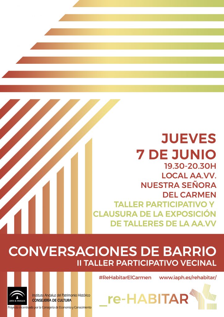 El equipo de Comunicación y Participación de _re-Habitar en colaboración con la AA.VV. Nuestra Señora de El Carmen de Triana han organizado el ‘II Taller participativo vecinal. Conversaciones de barrio’, que tiene por objeto compartir con el vecindario los resultados del estudio antropológico y generar un espacio de reflexión a partir del debate sobre los resultados expuestos. Los resultados de este taller se incluirán en los resultados generales del estudio antropológico.